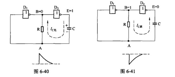 3.在電路剛翻轉(zhuǎn)為E=0時(shí),同樣由于電容C兩端電壓不能突變,導(dǎo)致A=0,B=1,電容C開(kāi)始經(jīng)R放電,放電電流Ic如圖6-41所示。